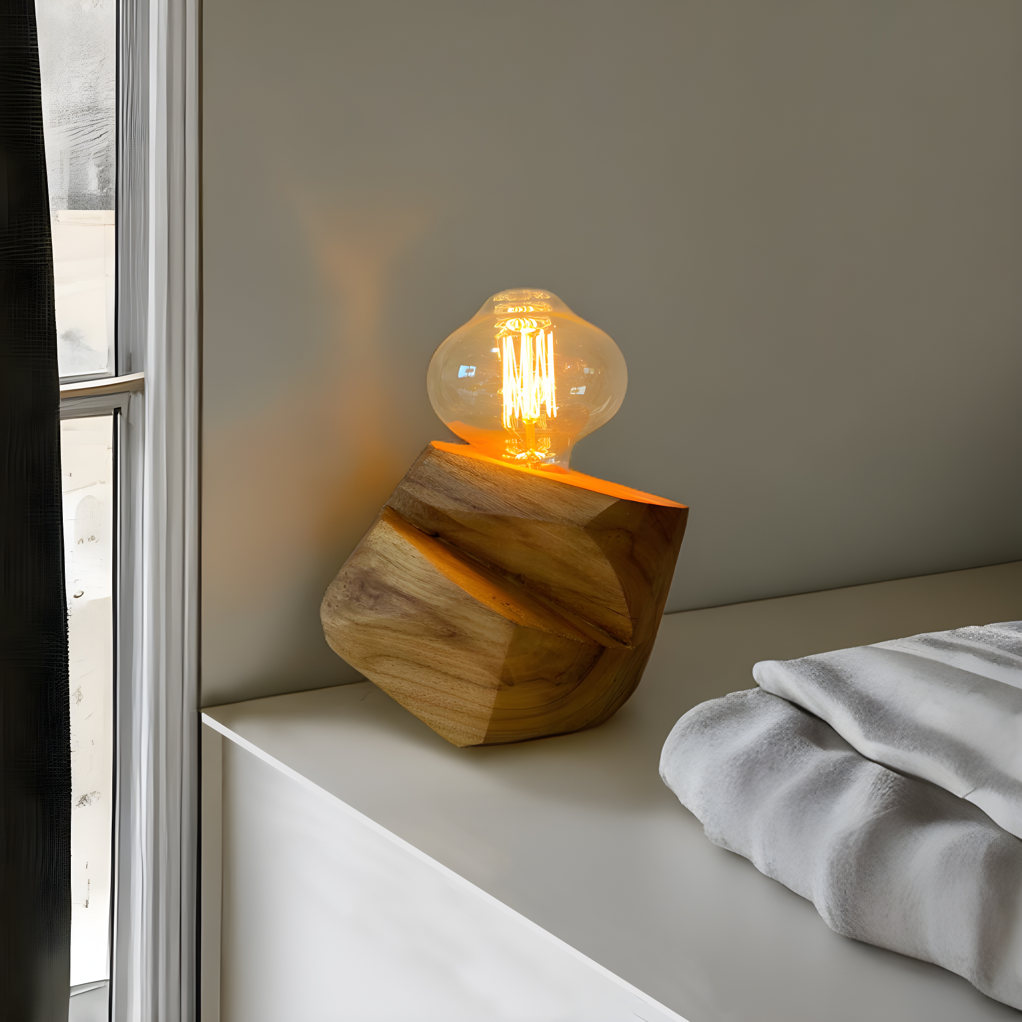 A Abajur Médio com Lâmpada de Filamento de Carbono é uma verdadeira obra de arte em forma de luz. Esculpida artesanalmente em madeira maciça Teca, sua estrutura remete à geometria natural de pedras e cristais com formas marcantes e cantos vivos que jamais se repetem. Cada peça é única, com veios e ângulos próprios, revelando a beleza orgânica da madeira e o toque singular do feito à mão.