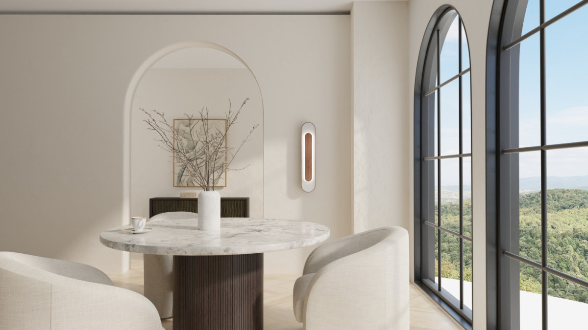 Arandela Petra Accord apresenta sua nova edição com lâmina de pedra natural ultrafina, trazendo um visual sofisticado e contemporâneo ao ambiente. A luz indireta realça a textura da pedra, criando um efeito suave e acolhedor na parede. Mesmo utilizando pedra verdadeira, a tecnologia de laminação garante uma peça leve, prática e fácil de instalar. Disponível também em acabamentos com lâmina de madeira natural ou tingida, para combinar com diferentes estilos de projeto.