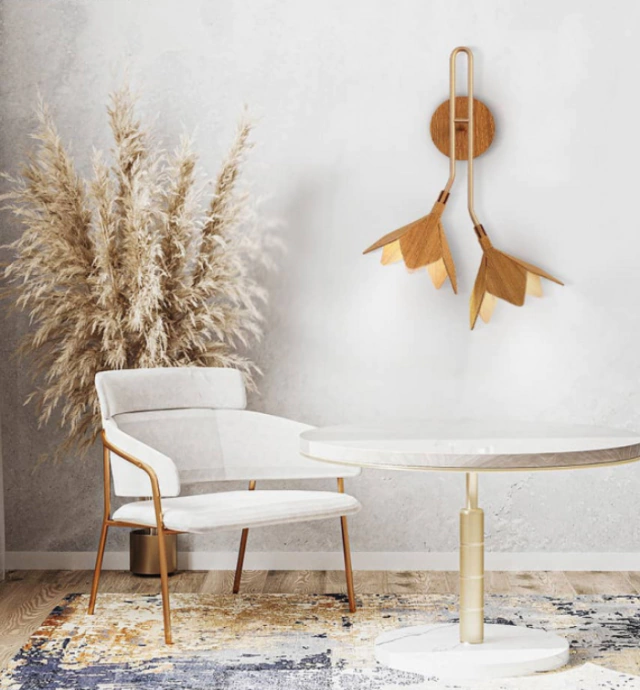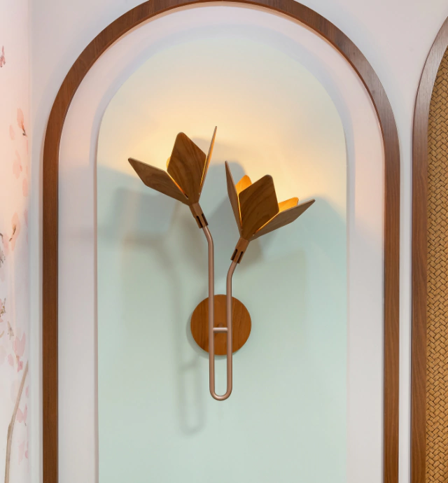 Com formas orgânicas e traços poéticos, a peça transforma a luz em um elemento de expressão natural e emocional. Suas pétalas esculpidas em lâmina de madeira natural evocam suavidade e leveza, enquanto a estrutura metálica que conecta os braços à base oferece equilíbrio visual e refinamento. O design único cria um efeito dinâmico de luz e sombra, como se dois ramos florissem suavemente a partir da parede.