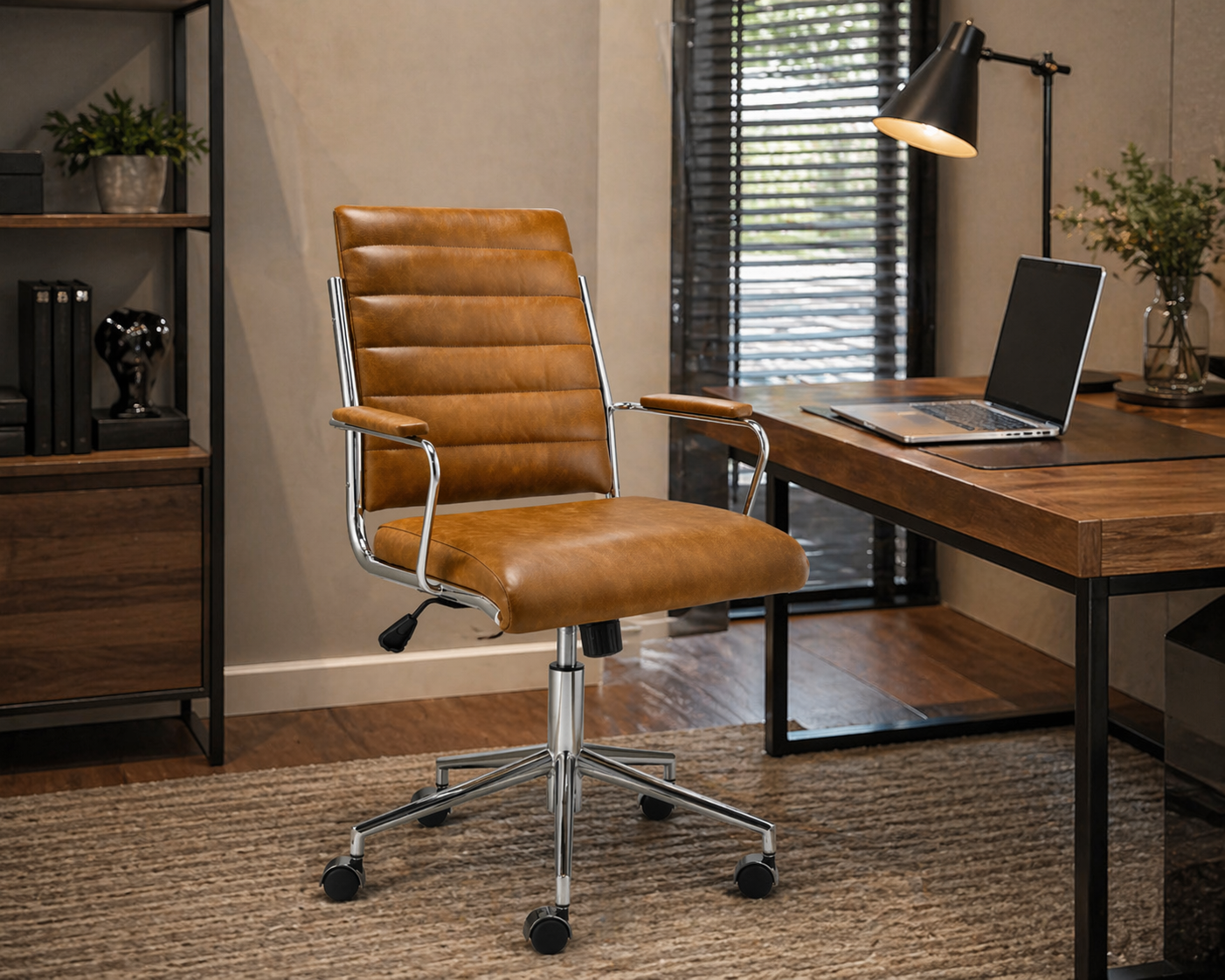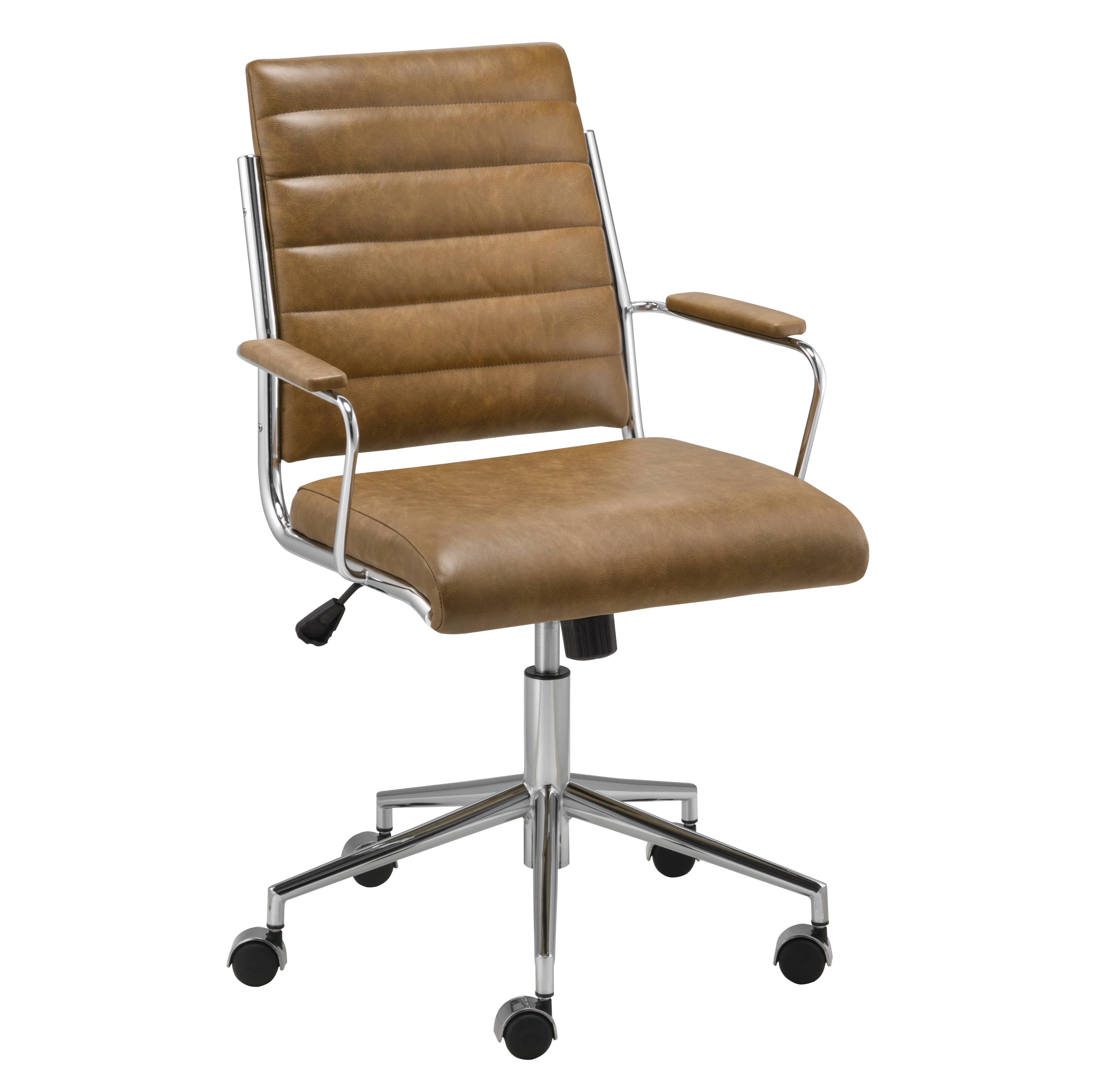 O design desta cadeira combina linhas envolventes e sofisticadas com a leveza do estofamento integral, valorizado pela base em aço carbono com rodízios e regulagem de altura que traz funcionalidade sem abrir mão da elegância.