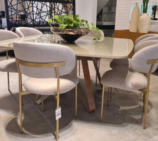 "Escolhi a cor champagne com tecido Softluxe cinza. Ficou perfeita com minha mesa em vidro."