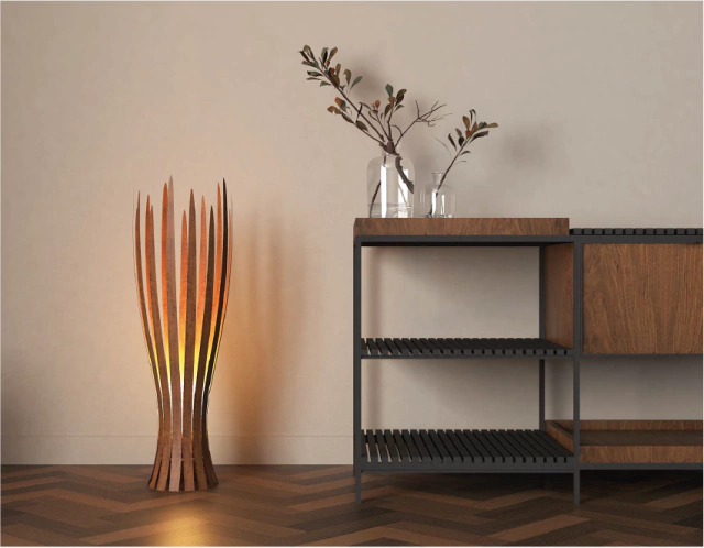 Material: Fabricado com lâmina natural de madeira e acrílico. Os acabamentos em madeira preservam a textura natural da lâmina, enquanto os tingidos são aplicados com precisão em cabines especializadas.