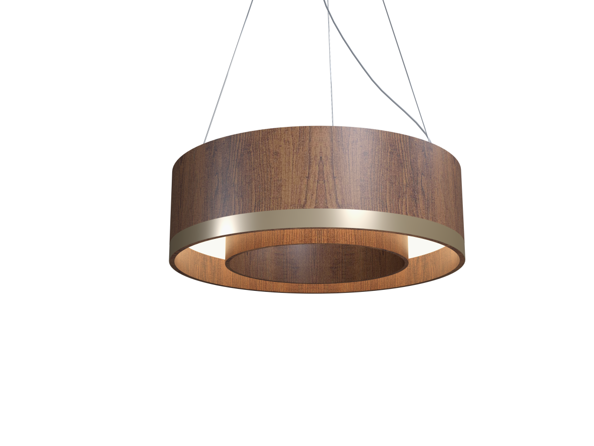 O Pendente Cilíndrico Latão Accord apresenta peças em lâmina de madeira natural ou tingida, agora refinadas pelo detalhe da borda em latão, que adiciona contraste sofisticado e valor estético ao design. O latão, aplicado como moldura sutil, realça o tom e a textura da madeira, resultando em um efeito visual equilibrado entre brilho e acolhimento.