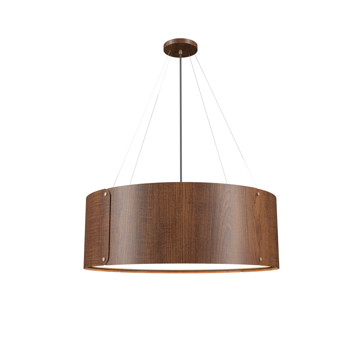 Inspirado na pureza das formas e na precisão construtiva, a luminária destaca curvas limpas em lâmina de madeira natural e detalhes em latão aparente, como soquetes e botões de fixação.