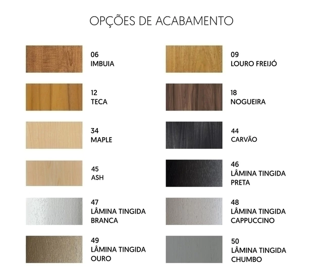 São diversas opções de cores, sendo opções em lâminas com a textura natural da madeira e lâminas tingidas, com acabamento de precisão e alta qualidade.