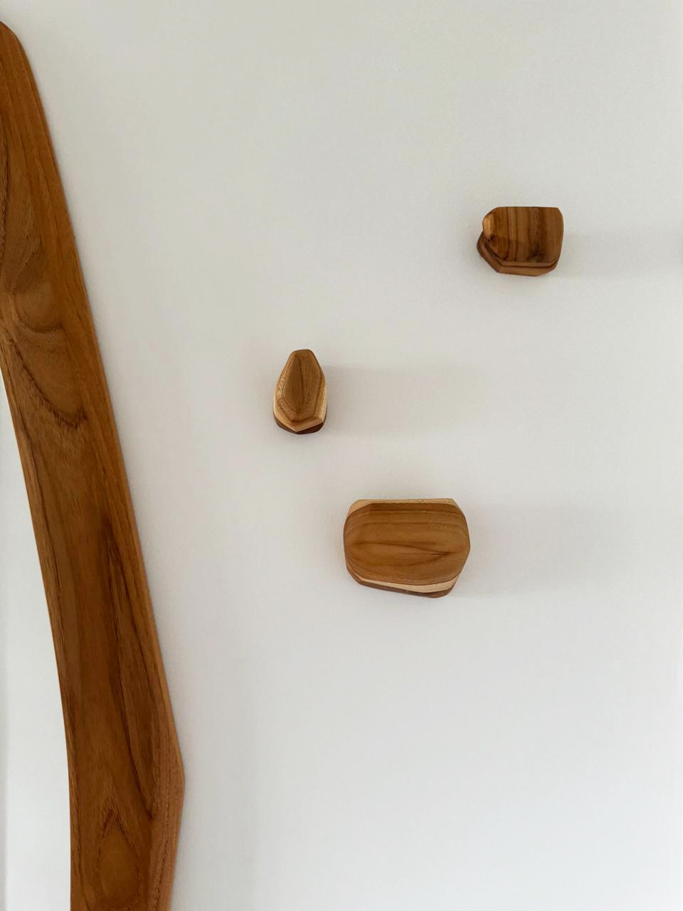 A Pendurador de Parede é uma verdadeira obra de arte em forma de luz. Esculpida artesanalmente em madeira maciça Teca, sua estrutura remete à geometria natural de pedras e cristais com formas marcantes e cantos vivos que jamais se repetem. Cada peça é única, com veios e ângulos próprios, revelando a beleza orgânica da madeira e o toque singular do feito à mão.